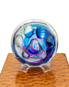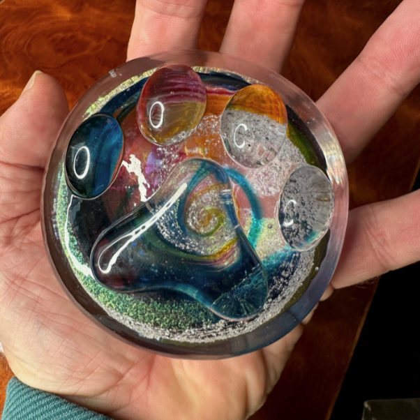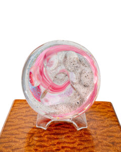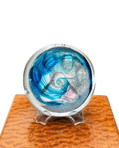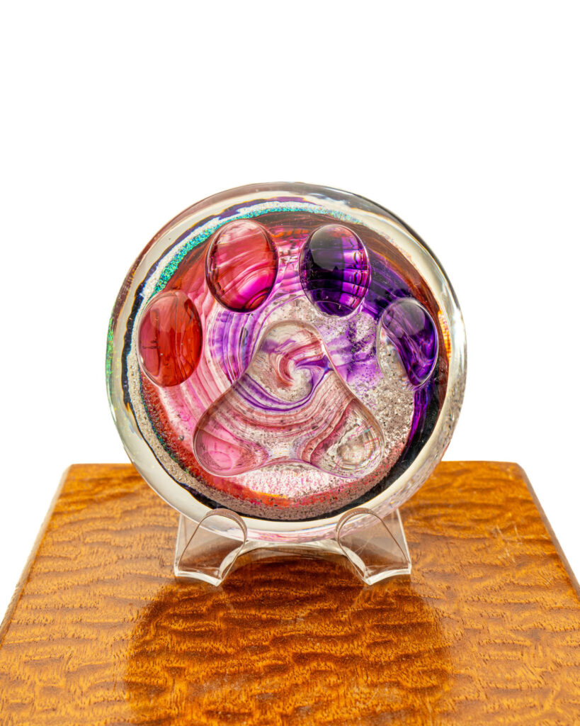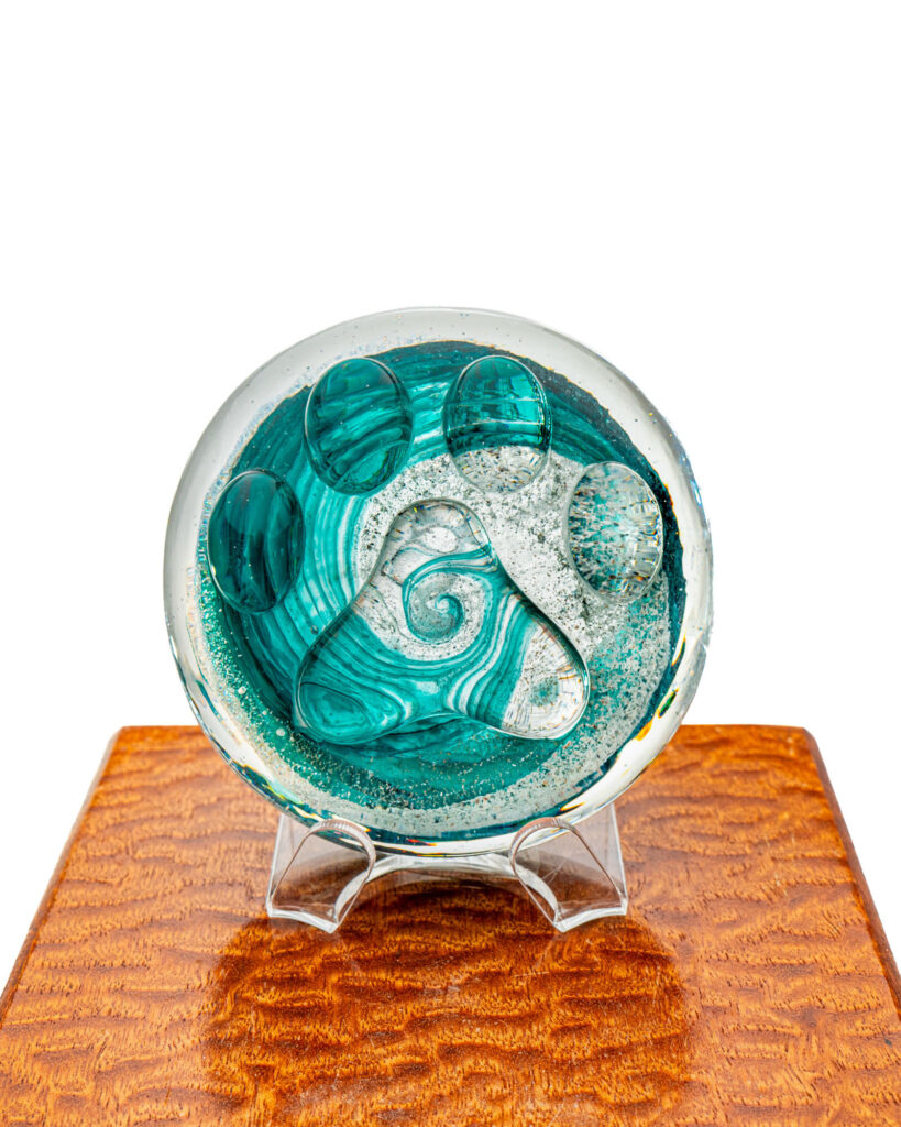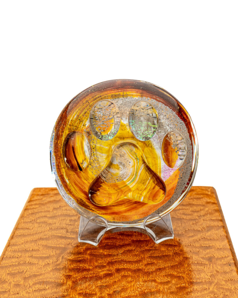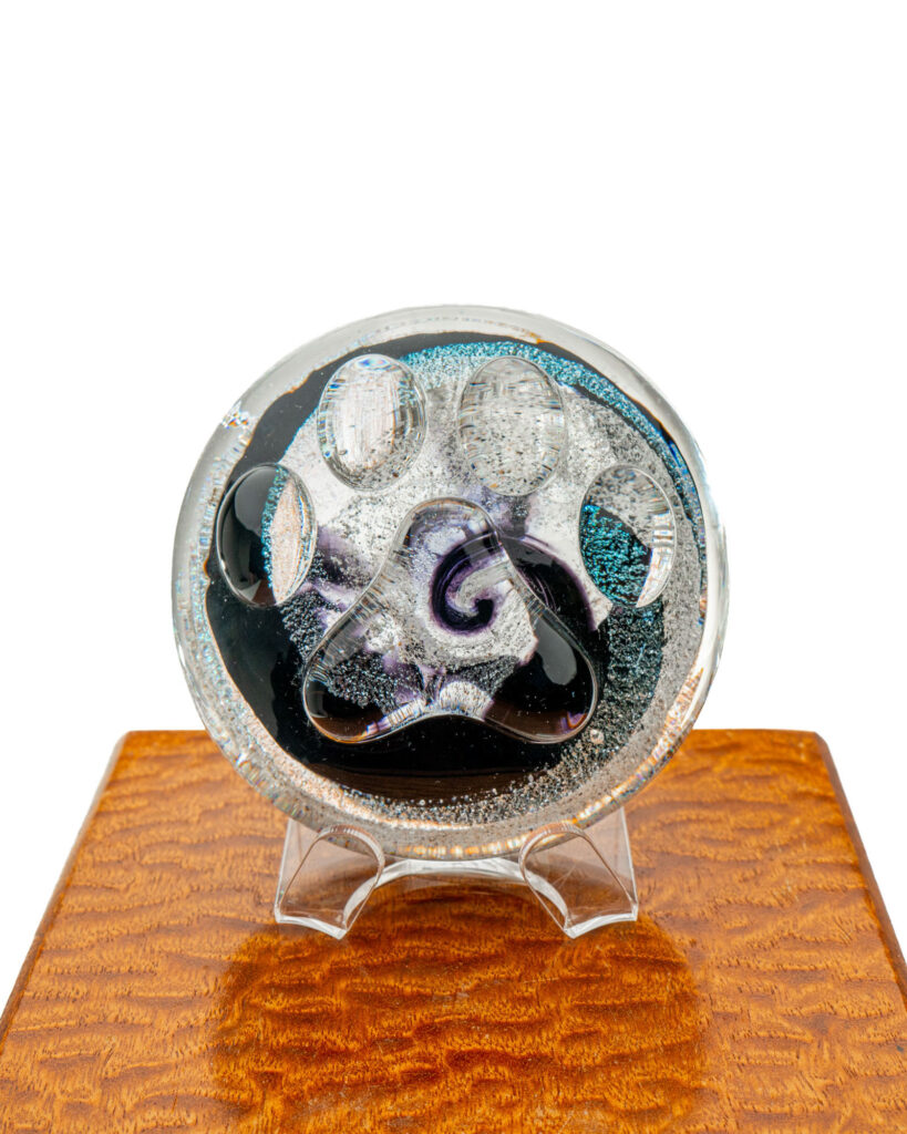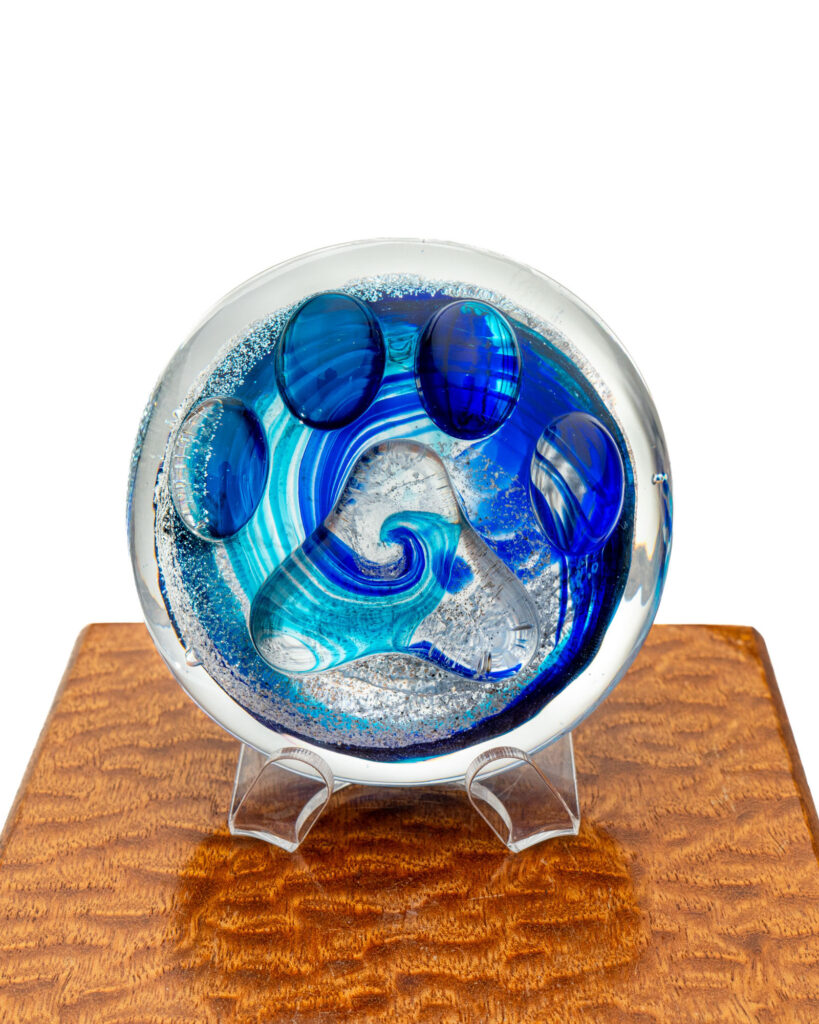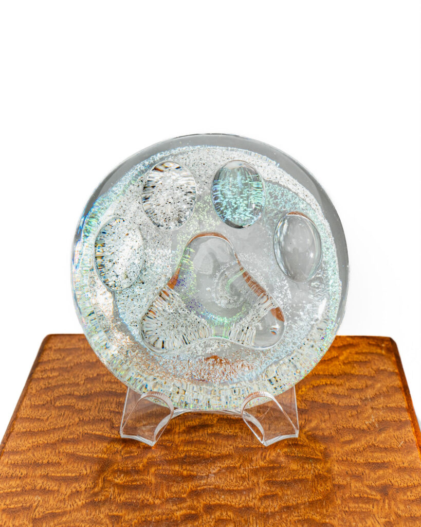 The white you see in all memorials are a thin layer of your Beloved Pets ashes, sealed within beautiful glass art forever. The Precious Paw Prints are approximately 3 1/2 inches across and a pound of solid glass. We would be very honored to create custom treasures for you.